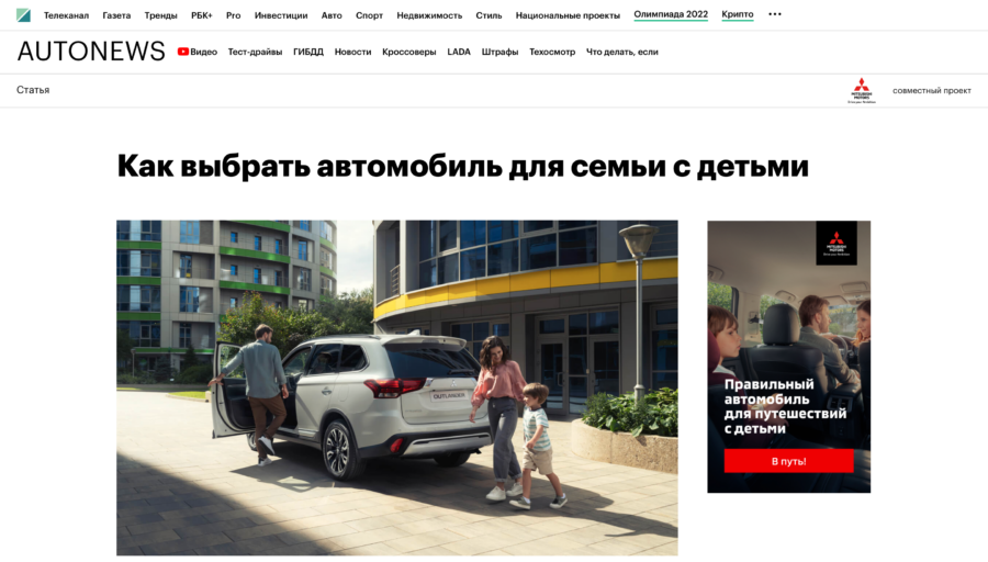 Проект был реализован в формате нативной статьи, в которой мы разобрались, какие критерии важно учитывать при выборе семейного автомобиля, и объяснили, как Mitsubishi Outlander им соответствует.