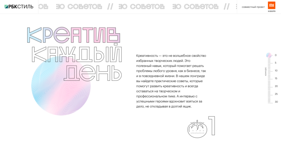 Мотивирующий контентный проект, в центре которого — лонгрид с 30 советами по повышению креативных навыков. Благодаря интеграции бренда в часть советов, основные преимущества смартфона нативно упомянуты в материале.